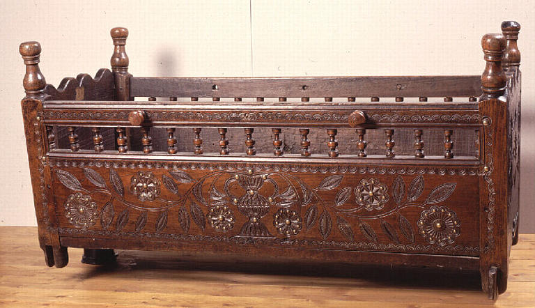 Tant que le lit de l'ouvrier de la ville et du paysan est resté l'agencement rudimentaire qu'il fut jusqu'au milieu du XIXe siècle, il y a toute apparence que celui des enfants ne fut, à son image, qu'une simple caisse aux parois assez hautes pour en protéger l'occupant contre la voracité des animaux circulant en liberté dans la salle commune (porcs et poules). Il n'en subsiste naturellement aucun exemple : on n'eut pas imaginé de porter respect à une simple caisse, fût-elle ornée de quelque entaille incisée au couteau. Le lit d'enfant n'apparaît dans le mobilier breton qu'en même temps que le lit-clos, à l'époque d'un certain épanouissement du tiers état populaire. L'on n'en connaît qu'un très petit nombre, parfois datés ; leur décoration reproduit fidèlement celle des lits dont les plus anciens ne remontent qu'au XVIIe siècle. Traité avec autant de soin que le lit, le berceau (lit d'enfant = 'ber'en breton) se plaçait ordinairement sur le banc devant le lit-clos ou était parfois suspendu à l'intérieur du lit-clos
