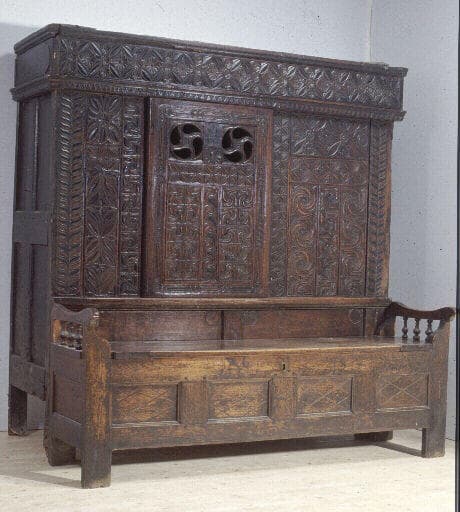Un meuble + une porte. ; C'est du logement communautaire, mêlant, dans une salle unique, parents, grands-parents, enfants, valets et servantes, que le lit-clos (gwele kloz) tire sans doute son origine : il procurait une intimité tout en protégeant du froid. Il domina en Basse-Bretagne, à partir du XVIIIe siècle, mais les logis les plus misérables ne connaissaient encore, au début du siècle suivant, que la très modeste 'couchette de clisses'de vannerie. Chez les paysans aisés, le lit-clos était souvent réservé au maître de maison, les autres membres de la maisonnée se contentant de châlits, coffres ouverts pourvus d'un ballot de paille. Les plus anciens lits-clos du Finistère sont des lits 'carosses', à trois ou quatre côtés ouverts, ou des lits d'angle, présents en Léon au XVIIe siècle. Leur succédèrent les lits à encastrer, ouverts et ornés seulement en façade, incorporés dans l'alignement des meubles de la salle commune. Un lit échappait à cette disposition, placé face à la table et accolé d'un coffre qui servait de banc