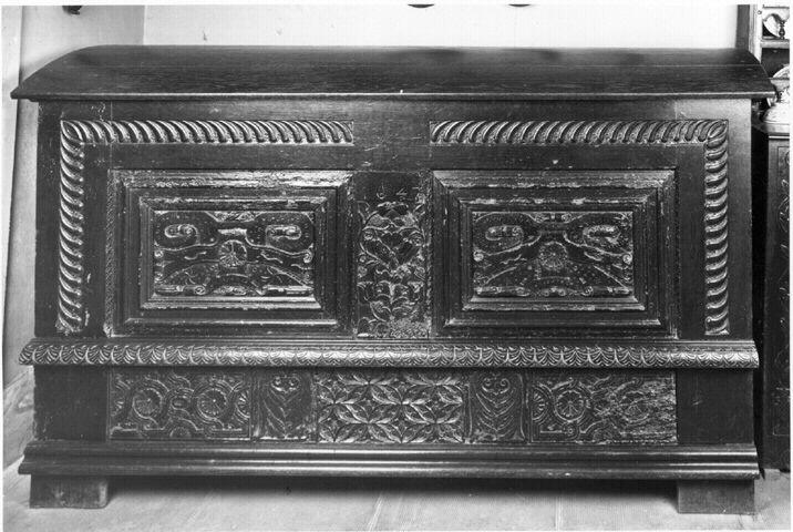 Né du nomadisme, le coffre est le plus ancien des meubles et fut longtemps utilisé à l'exclusion de tout autre. On y stockait les céréales comme les vêtements ; l'armoire ne lui succéda que tardivement pour le rangement de ces derniers. Les inventaires après décès du Léon et de Haute-Cornouaille indiquent aux XVIe et XVIIe siècles sa place prépondérante parmi les biens des couches aisées de la société rurale. Coffres 'à garder le blé'et 'huges'(huches) plates 'à garder les draps'paraissent étroitement liés à la culture du lin qui fit la prospérité de cette zone. Les premiers, à couvercle bombé, sont hauts de plus d'un mètre et longs du double. Les coffres à draps et vêtements sont nettement moins longs (130 à 150 cm). Le décor sculpté en léger relief est concentré sur les panneaux verticaux de la façade. Plusieurs répertoires s'y développent et parfois s'entremêlent. A la tradition gothique, qui survécut dans le mobilier breton jusqu'au XVIIe siècle, se rattachent les 'plis de serviettes'(moulures verticales), les soufflets, larmes et la plupart des motifs tracés au compas : fleurons, rosaces, etc. Les variations décoratives de la Renaissance française constituent la seconde source de l'ornementation des coffres bretons, empruntée à l'architecture léonarde : rinceaux, entrelacs, mascarons, angelots, pampres, cariatides... La représentation humaine, enfin, y est abondante : saints, vie du Christ, scènes de chasse, etc