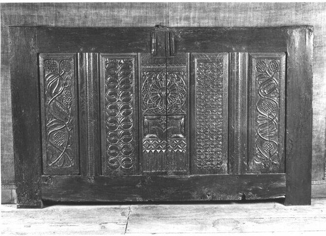 Devant de coffre en chêne, décoré de cinq panneaux au décor dissemblable d'influence gothique. Influence des lambris capitulaires des grandes cathédrales gothiques. Renfort arrière en sapin
