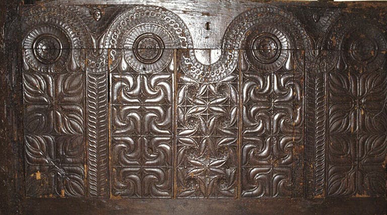 Le décor sculpté des coffres, en léger relief, est généralement concentré sur les panneaux verticaux de la façade. Plusieurs répertoires s'y développent et parfois s'entremêlent. A la tradition gothique, qui survécut dans le mobilier breton jusqu'au XVIIe siècle, se rattachent les 'plis de serviettes'(moulures verticales), les soufflets, larmes et la plupart des motifs tracés au compas : fleurons, rosaces, etc. Les variations décoratives de la Renaissance française constituent la seconde source de l'ornementation des coffres bretons, empruntée à l'architecture léonarde : rinceaux, entrelacs, mascarons, angelots, pampres, caryatides... La représentation humaine, enfin, y est abondante : saints, vie du Christ, scènes de chasse, etc