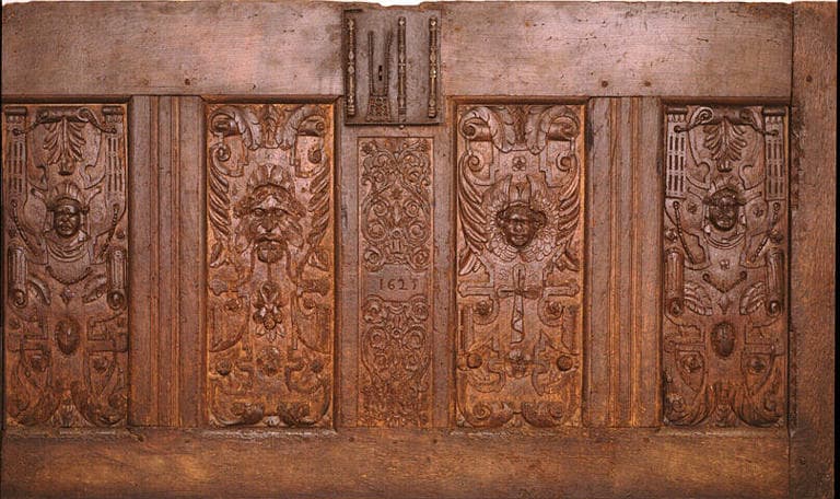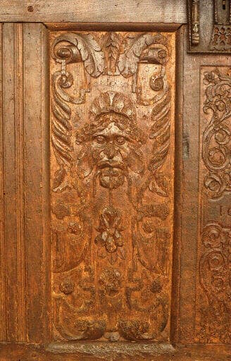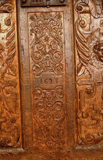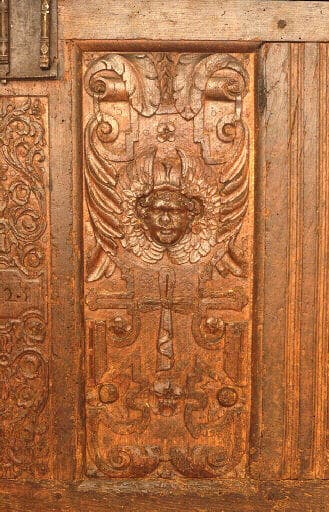 Le décor sculpté des coffres, en léger relief, est généralement concentré sur les panneaux verticaux de la façade. Plusieurs répertoires s'y développent et parfois s'entremêlent. A la tradition gothique, qui survécut dans le mobilier breton jusqu'au XVIIe siècle, se rattachent les 'plis de serviettes'(moulures verticales), les soufflets, larmes et la plupart des motifs tracés au compas : fleurons, rosaces, etc. Les variations décoratives de la Renaissance française constituent la seconde source de l'ornementation des coffres bretons, empruntée à l'architecture léonarde : rinceaux, entrelacs, mascarons, angelots, pampres, caryatides... La représentation humaine, enfin, y est abondante : saints, vie du Christ, scènes de chasse, etc