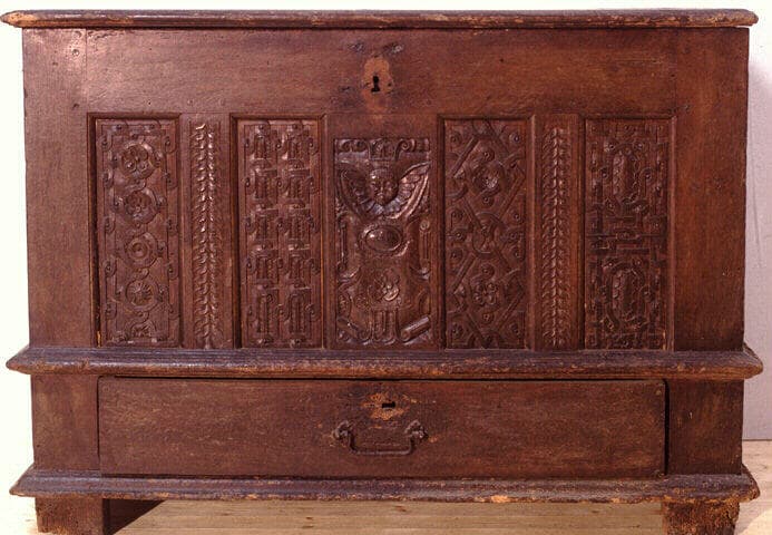 R.2002.31.1. = coffre. R.2002.31.2. = tiroir. ; Né du nomadisme, le coffre est le plus ancien des meubles et fut longtemps utilisé à l'exclusion de tout autre. On y stockait les céréales comme les vêtements ; l'armoire ne lui succéda que tardivement pour le rangement de ces derniers. Les inventaires après décès du Léon et de Haute-Cornouaille indiquent, aux XVIe et XVIIe siècles, sa place prépondérante parmi les biens des couches aisées de la société rurale. Coffres 'à garder le blé'et 'huges'(huches) plates 'à garder les draps'paraissent étroitement liés à la culture du lin qui fit la prospérité de cette zone. Les premiers, à couvercle bombé, sont hauts de plus d'un mètre et longs du double. Les coffres à draps et vêtements sont nettement moins longs (130 à 150 cm). Le décor sculpté en léger relief est concentré sur les panneaux verticaux de la façade. Plusieurs répertoires s'y développent et parfois s'entremêlent. A la tradition gothique, qui survécut dans le mobilier breton jusqu'au XVIIe siècle, se rattachent les 'plis de serviettes'(moulures verticales), les soufflets, larmes et la plupart des motifs tracés au compas : fleurons, rosaces, etc. Les variations décoratives de la Renaissance française constituent la seconde source de l'ornementation des coffres bretons, empruntée à l'architecture léonarde : rinceaux, entrelacs, mascarons, angelots, pampres, caryatides... La représentation humaine, enfin, y est abondante : saints, vie du Christ, scènes de chasse, etc