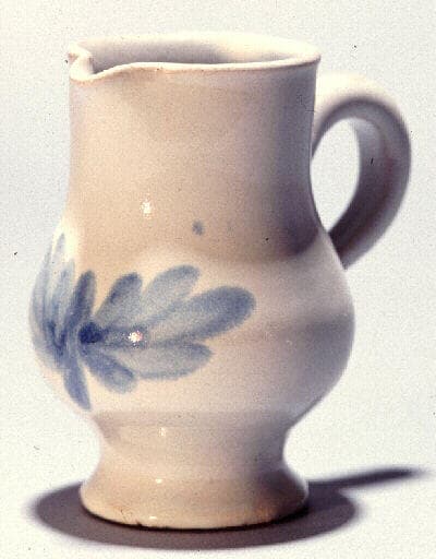 petit pichet à anse et bec verseur. Forme galbée. Décor bleu sur fond blanc, deux feuilles