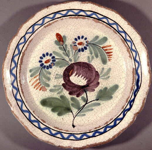 Bassin et marli : décor polychrome sur fond blanc (fleurs et feuillage au bassin ; ligne ondulante au marli). Marli chantourné
