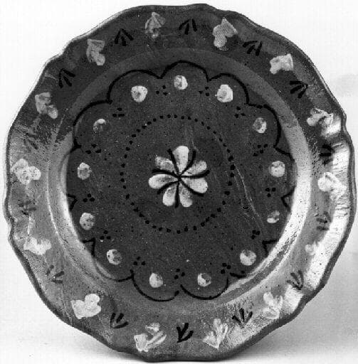 Plat figurant un décor floral (fleur au centre, entourée de points, et guirlande de feuilles sur le pourtour)