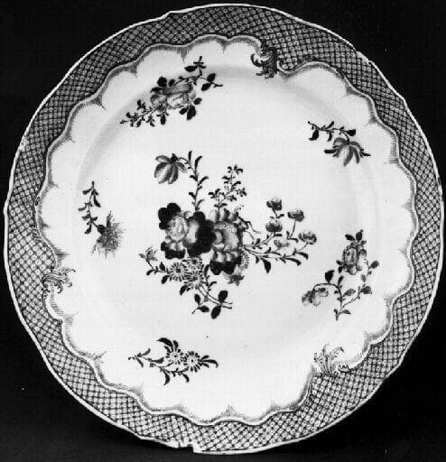 Assiette en porcelaine de style compagnie des Indes, à décor floral (motif centré, entouré de cinq autres motifs plus petits). Liseré à quadrillage sur le pourtour