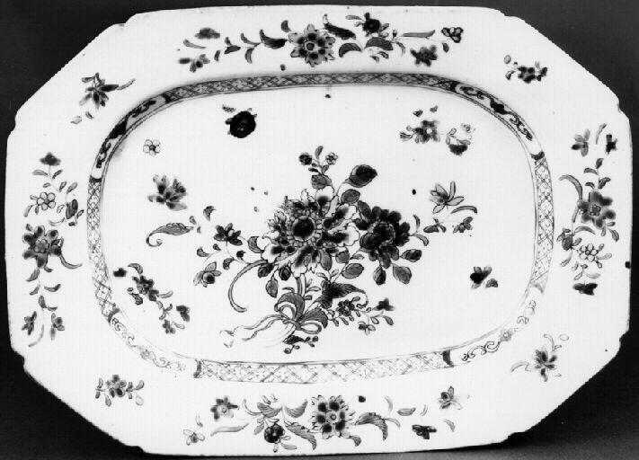 Plat long de style compagnie des Indes, à décor floral (motif centré, entouré de plus petits motifs). Liseré quadrillé sur le pourtour extérieur du bassin