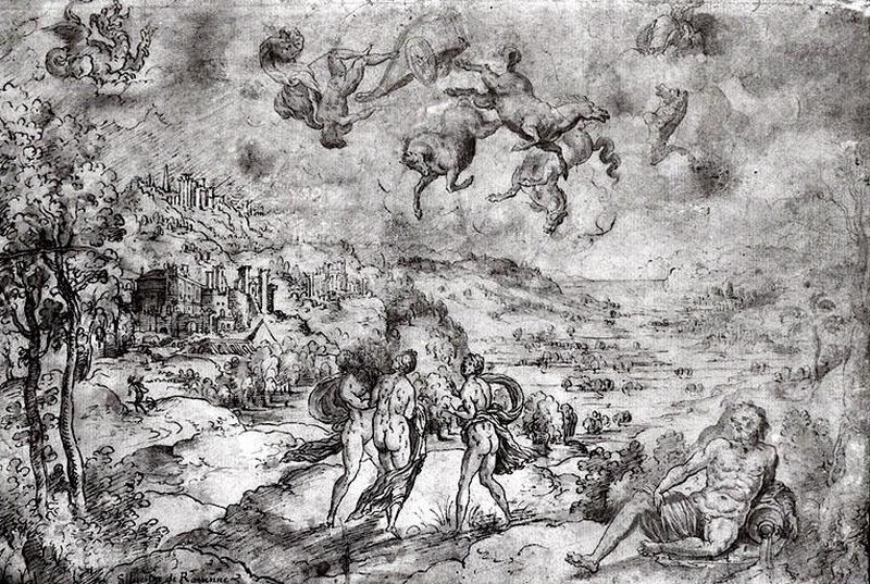 scène mythologique (chute, Phaéton, mort, char, cheval : dans les airs, nuage, homme, nudité, pot, femme, feuillu) ; fond de paysage (colline, village)