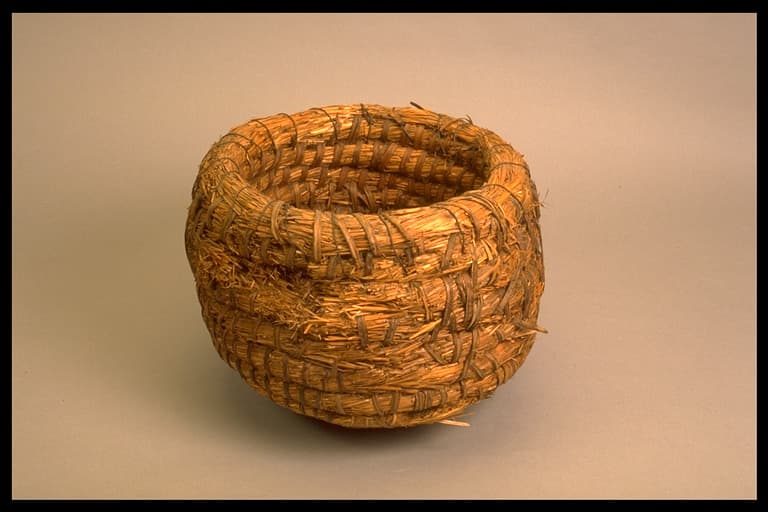 Ruche : vannerie composée d'un boudin de paille roulé en spirales. Les spires sont cousues bord à bord par de l'éclisse de ronce. Fond concave et bords arrondis. L'épaisseur du boudin est de 5 à 6 cm. La ronce est remplacée par du fil de fer sur le bord supérieur (réparation).