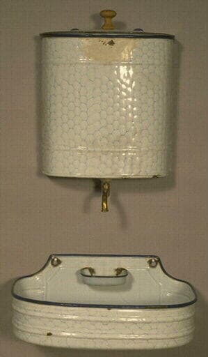 Fontaine comprenant un réservoir de fontaine à suspendre (deux attaches à la partie supérieure) avec un robinet en cuivre à la partie inférieure. Couvercle à rebord couvrant et un bouton en bois de préhension. Bbassin à suspendre par deux encoches pratiquées sur la face arrière. Sur cette même face arrière, un petit bassin beaucoup plus petit avec dispositif d'écoulement fait de petits trous circulaires