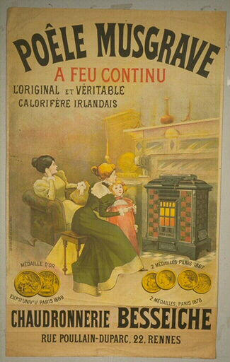 De haut en bas sont imprimées, les indications suivantes : - 'Poêle Musgrave.' A feu continu. L'original et véritable calorifère irlandais. - 'Chaudonnerie Besseiche rue Poullain-Duparc, 22, Rennes..' (imprimée en noir sur une bande de papier collée dans la partie inférieure de l'affiche). -Sous cette bande de papier collé: Musgrave et Cie, 240 rue de Rivoli, Paris