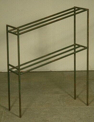 présentoir métallique de couleur verte, composé de deux étagères constituées de tiges métalliques assemblées. Chaque étagère comporte trois tiges