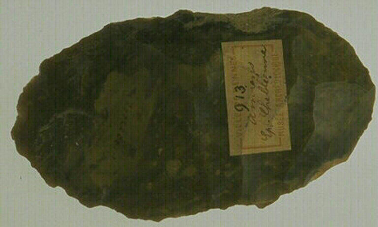 Taille par percussion ; percuteur dur puis percuteur tendre. ; Biface dont la forme générale est de type amygdaloïde, présentant une base arrondie et une extrémité distale large. L'arête est sinueuse. Traces de cortex. Le silex est de couleur brune.