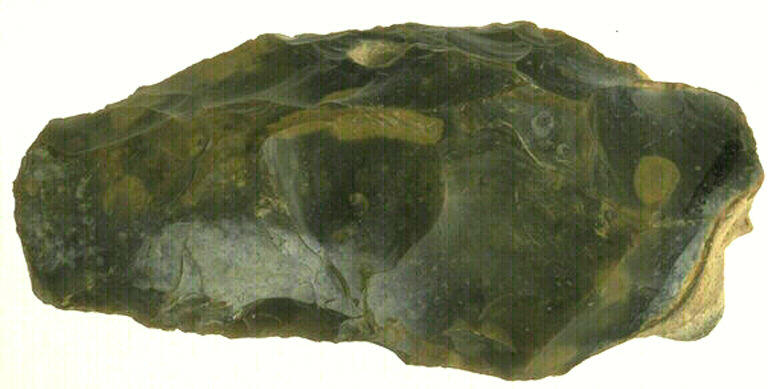 Taille au percuteur dur et tendre. ; Biface large, de forme amygdaloïde (?). Il semble manquer un morceau dans la partie distale. Le talon est arrondi, les bords concaves, et l'arête presque rectiligne. Silex de couleur orangée.