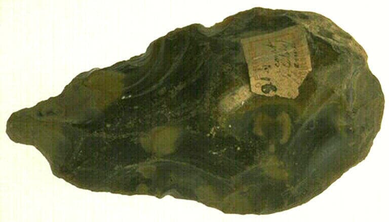 Taille par percussion ; percuteur dur. ; Biface épais à arête zigzaguante, de section triédrique. Le talon, large, présente des traces de cortex. Le silex est de couleur brune.