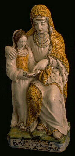 représente Sainte Anne apprenant à lire à Marie enfant. Anne est assise, un livre ouvert posé sur ses genoux. Marie est représentée debout près d'elle. Ce groupe en faïence de Rennes présente un décor polychrome réalisé en vert, violet manganèse, bleu, brun et jaune. Cette dernière couleur est caractéristique de l'époque de la faïence de Rennes dite italienne