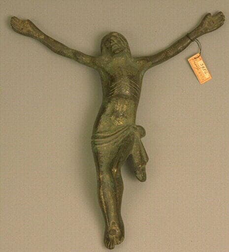 Christ en croix en bronze (traces de dorure) : il est vêtu d'une draperie nouée à la ceinture. Sa tête est rejetée en arrière