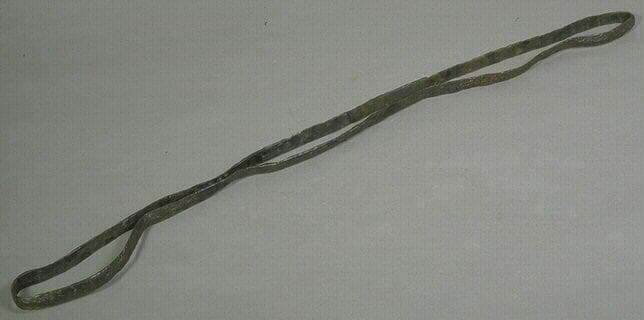Cerclage de roue fait d'une bande de métal aplatie. Compressée, elle forme une boucle étroite.