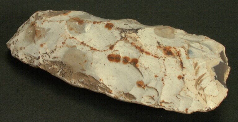 silex blanc ; taille par percussion. ; Ebauche de hache polie au tranchant convexe et au talon en pointe.