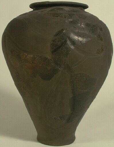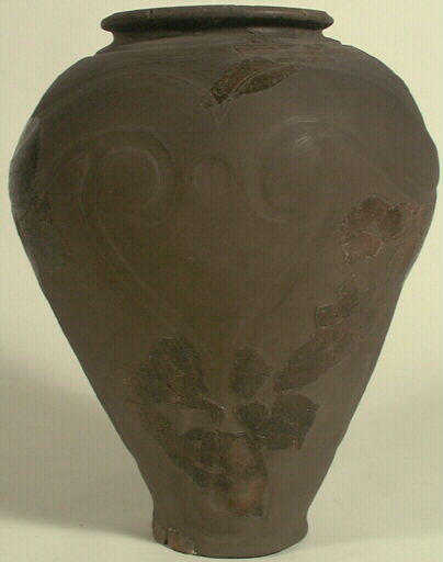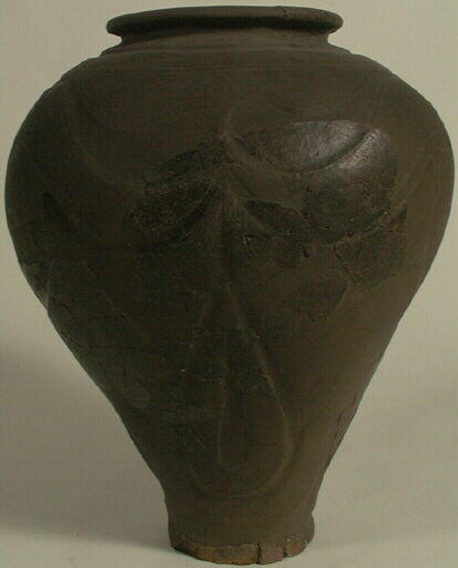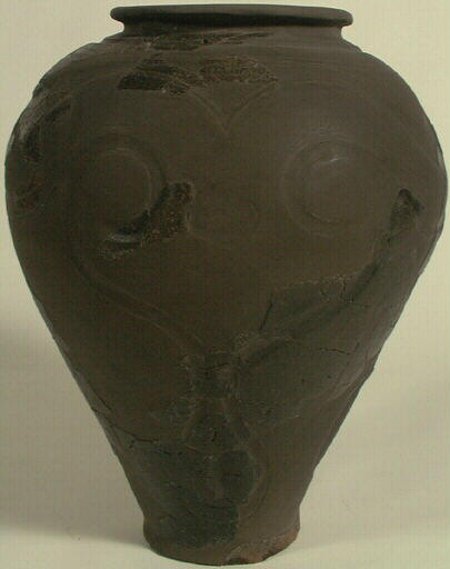 Céramique montée au colombin, lustrée, lissée, avec décor gravé vraisemblablement dans la pâte fraîche. ; Grand vase à panse renflée, au pied étroit. Il présente une ouverture relativement étroite part rapport à la panse, à large lèvre aplanie. Il est orné d'un décor de lignes sinueuses gravées dans la pâte. Ce décor de doubles lignes vient se dérouler sur tout le tour du vase ; certaines de ces doubles lignes délimitent des bandes qui apparaissent en creux. Outre ce jeu de relief, des bandes de motifs géométriques (losanges, losanges pointés, hachures, lignes en 'vague') sont concentrées dans la partie supérieure sur le pourtour. Sur la panse, en partie basse, des lignes obliques forment quatre grandes esses en creux. Une palmette s'inscrit en opposé des esses, et au milieu un 'éventail', en relief, est pourvu d'un décor de fines lignes gravées (lignes pleines alternant avec des lignes en pointillés) se terminant par des cercles pointés.