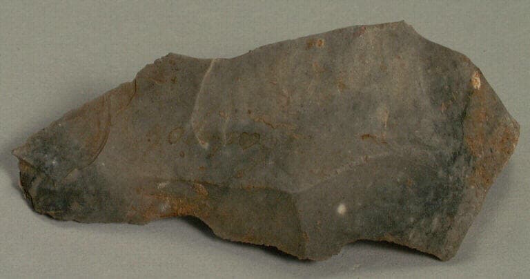 silex gris. ; Eclat laminaire de silex au talon cassé avec des restes de sédiments contenant des esquilles osseuses et des charbons de bois.