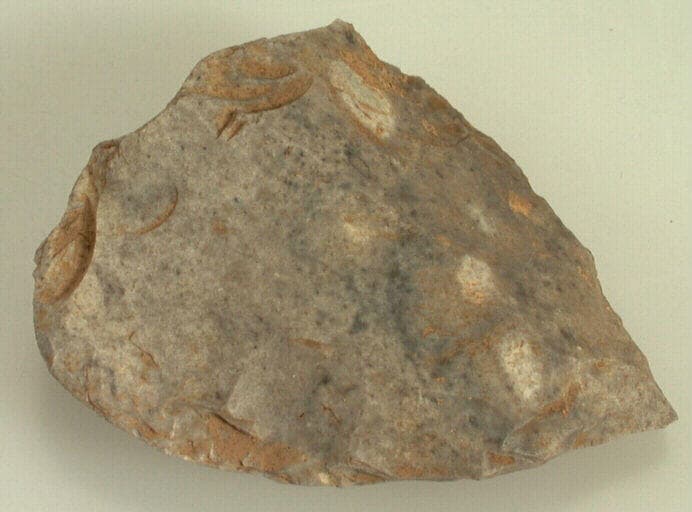 silex gris. ; Racloir convergent convexe sur pointe pseudo-levallois au talon facetté.