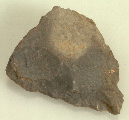 silex gris. ; Racloir convergent droit sur éclat de débitage, au talon facetté et aux retouches simples.