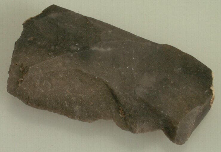 silex noir ; Double encoche sur éclat de débitage à talon demi facetté. Double bulbe de percussion. Retouche directe et inverse.