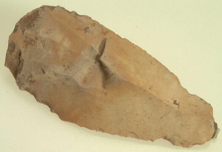 silex blanc ; Lame de silex retouchée à un côté plat et un côté convexe, au talon lisse et aux tranchants émoussés.