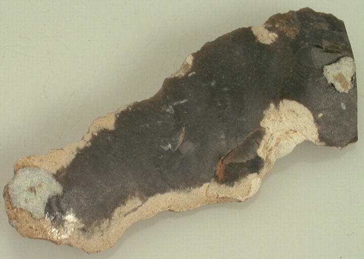 silex noir et blanc. ; Lame de silex légèrement retouchée à la base et au talon lisse.