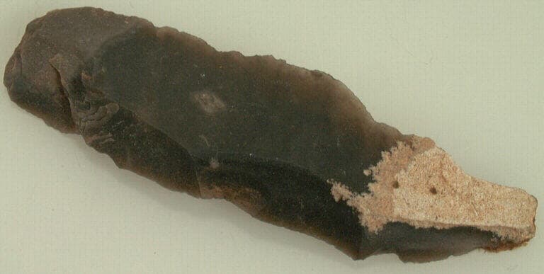 silex noir ; Lame de silex au talon lisse, à un côté plat et un côté convexe.
