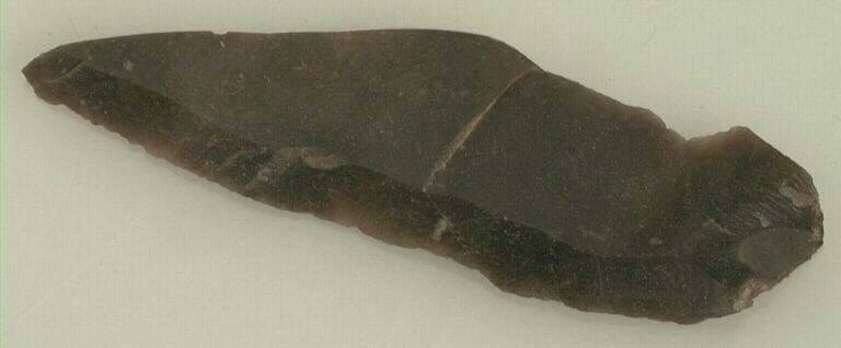 silex noir ; Fragment de lame à un côté plat et un côté convexe.