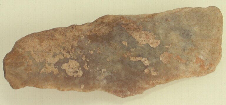 silex jaune ; Lame de silex à un côté plat et un côté convexe et au talon lisse.