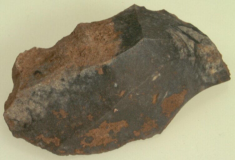 silex noir ; Eclat de silex retouché à un côté plat et un côté convexe.
