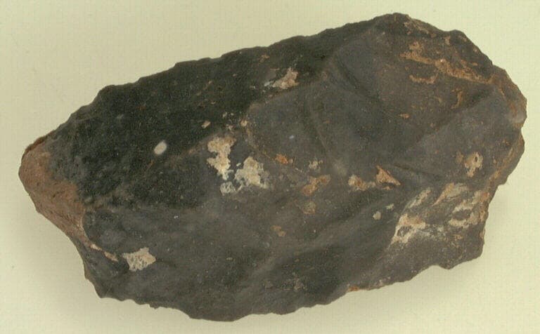 silex noir ; Eclat de silex légèrement retouché au talon lisse.