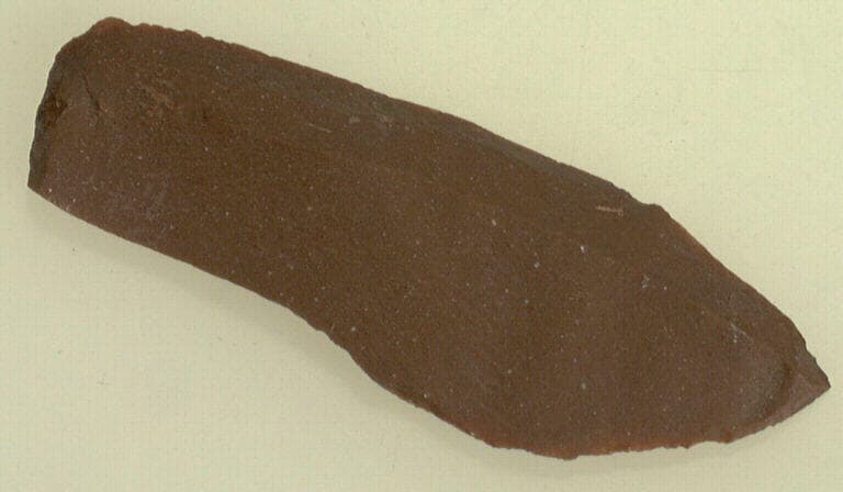 silex rouge ; Lame de silex à un côté plat et un côté convexe et aux tranchants peu émoussés.