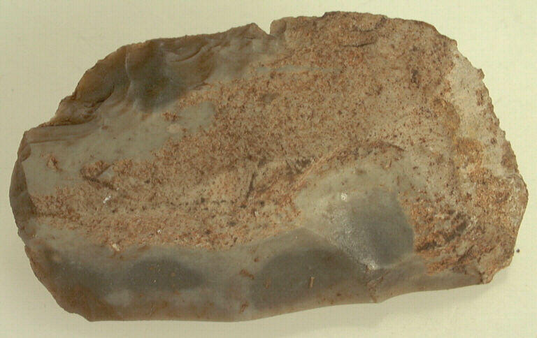 silex gris et blanc. ; Racloir sur éclat de débitage à un côté plat et un côté convexe et au tranchant émoussé.