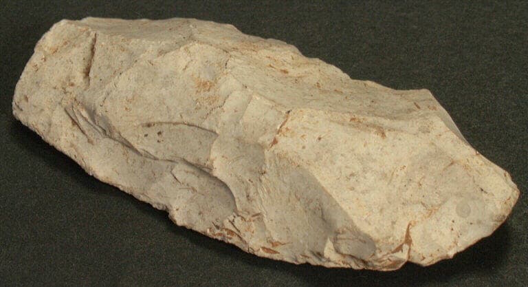 silex blanc ; Racloir sur éclat de débitage à un côté plat et un côté convexe.
