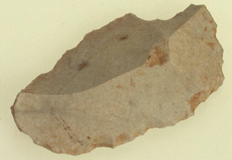 silex blanc ; Racloir sur éclat de débitage à un côté plat et un côté convexe.