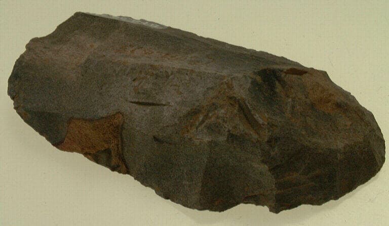 silex noir ; Grattoir sur éclat de débitage à un côté plat et un côté convexe.