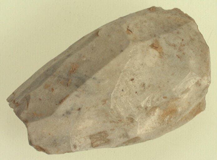 silex blanc ; Petit nucléus à lamelle de débitages en silex blanc préparé pour débiter des éclats comme on peut le constater avec la trace en négatif sur les faces. Le plan de frappe est bien visible.