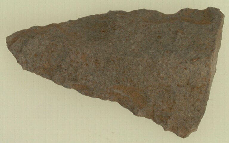 silex gris. ; Pointe de silex à un côté plat et un côté convexe et à la section triangulaire.
