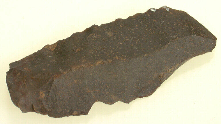 silex noir ; Lame de silex retouchée à un côté plat et un côté convexe. Burin en bout de lame.