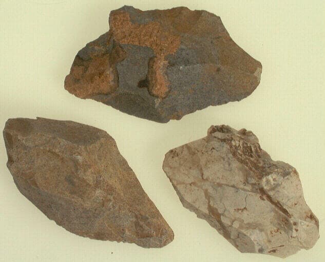 silex gris, blanc. ; Trois éclat de débitage non retouchés. Présence du cortex sur l'un des éclats.