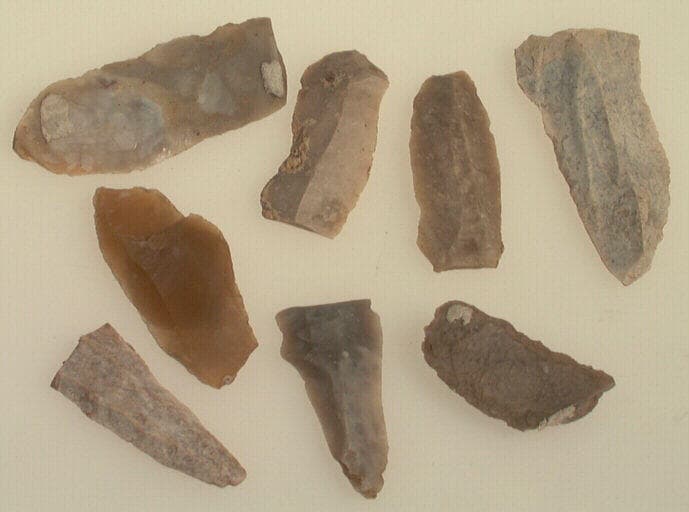 silex blanc, jaune, gris. ; Huit lames de silex tronquées.