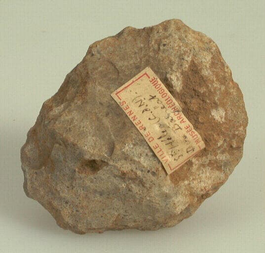 grès lustré. Il était recherché par les hommes préhistoriques, sans doute en remplacement du silex peu accessible à cette période et dont il possède les mêmes qualités clastiques. ; Biface cordiforme à l'extrémité distale brisée.