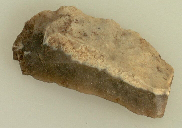 silex jaune ; Lamelle de silex à un côté plat et un côté convexe et au talon lisse.