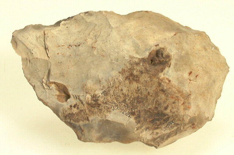 Taille par percussion ; percuteur dur puis percuteur tendre. ; Biface plat, de forme amygdaloïde, présentant une base arrondie et une extrémité distale large et cassée (?). L'arête est sinueuse. L'outil conserve ici une trace de cortex. Le silex est de couleur blanche.