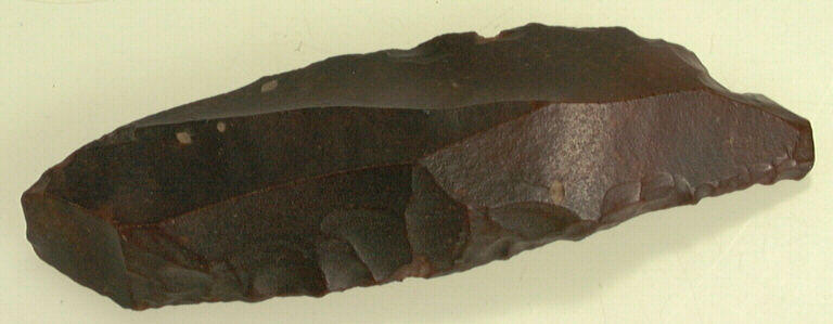 silex rouge ; Burin sur lame à un côté plat et un côté convexe.
